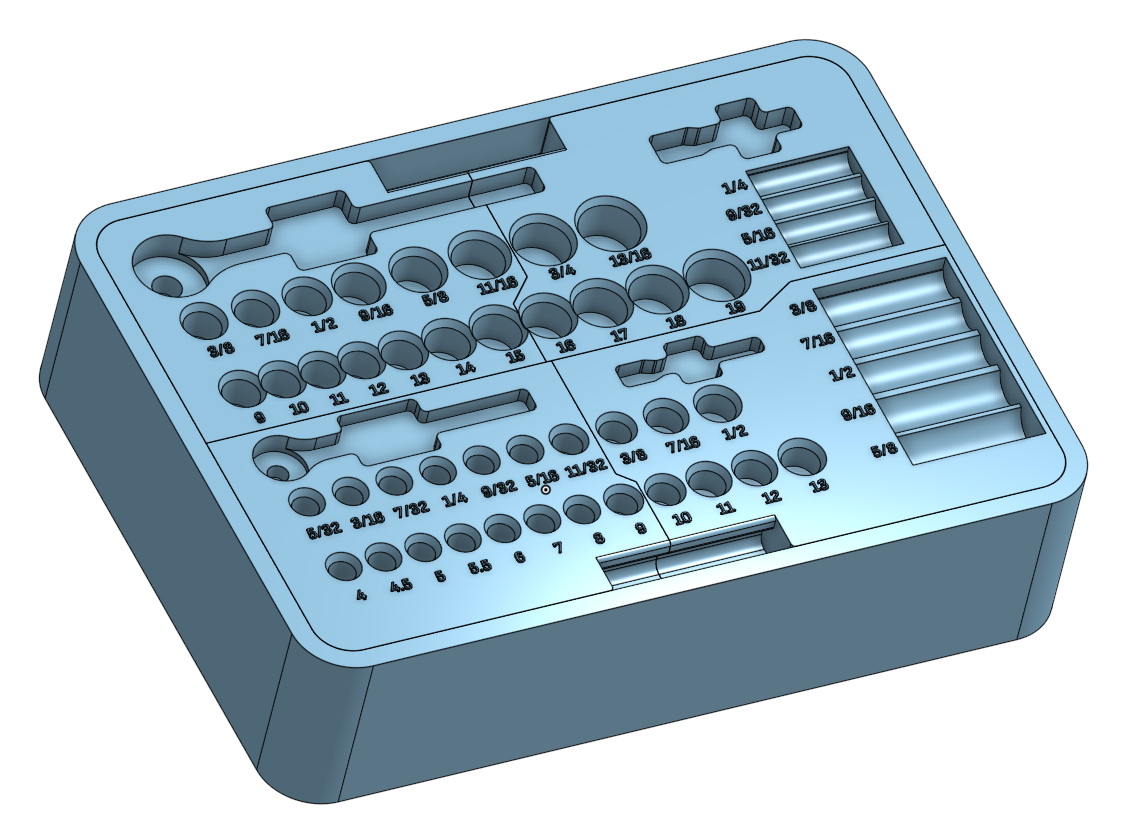 I started with a weatherproof case and several separate tool sets that included metric and SAE sockets for 1/4” and 3/8” drive ratchets as well as metric and SAE wrenches. I decided to split the case into a top layer for sockets and a bottom layer for wrenches and other hand tools. After lots of measuring I designed a socket tray that was 3D printed in 4 sections and held together with 1/4” steel rods. Each socket has a precisely sized hole that along with the large labels and metric/SAE color coding should make it easy to return the tools to their rightful place after use.